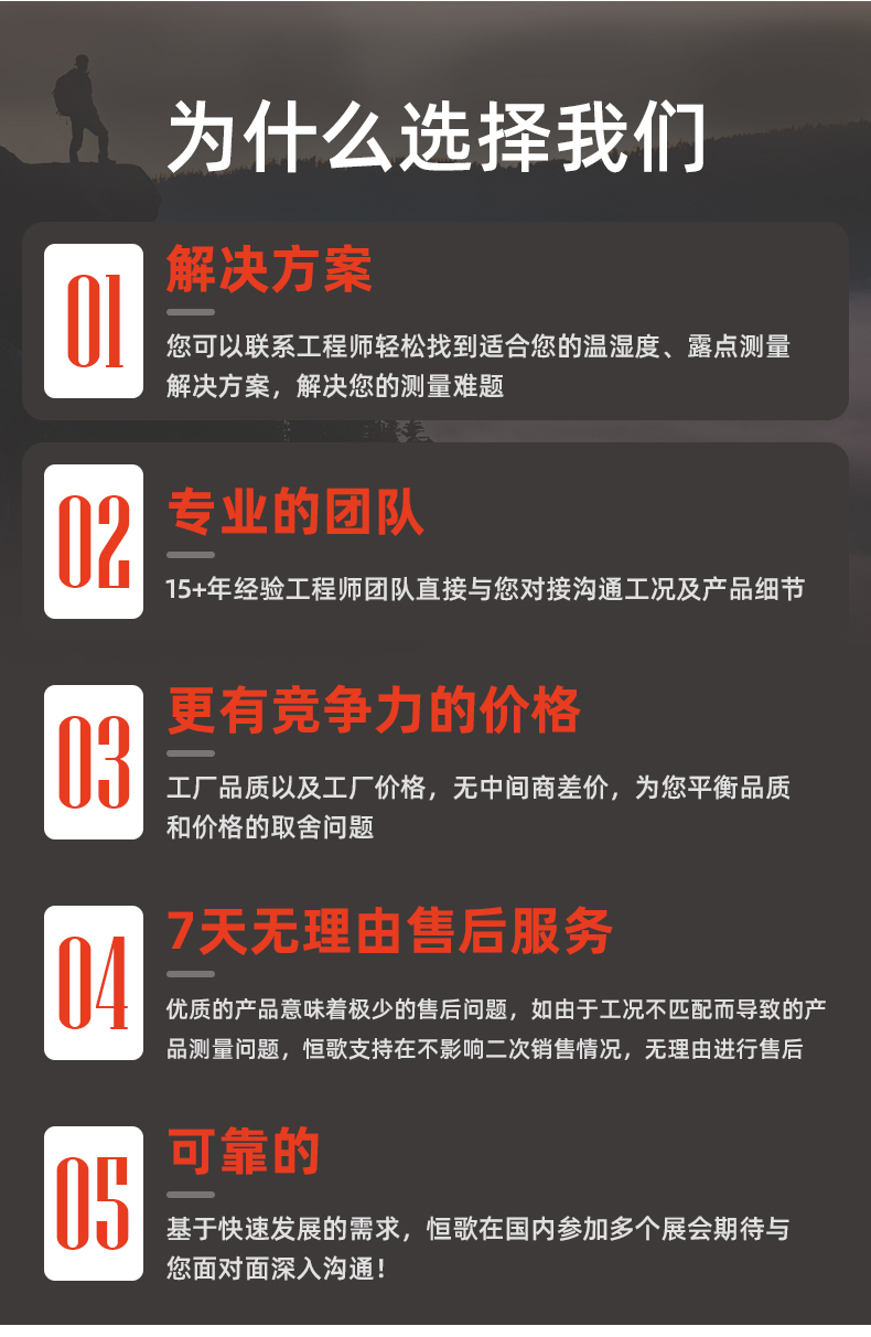 恒歌露點變送器采用瑞士 SENSIRION 進口 SHT 系列溫濕度傳感器,可同時采集溫度及濕度數據,具有精度高、功耗低、一致性好的特點;采集到的溫濕度信號數據,同時計算露點、濕球數據,可通過 RS485 接口輸出。
